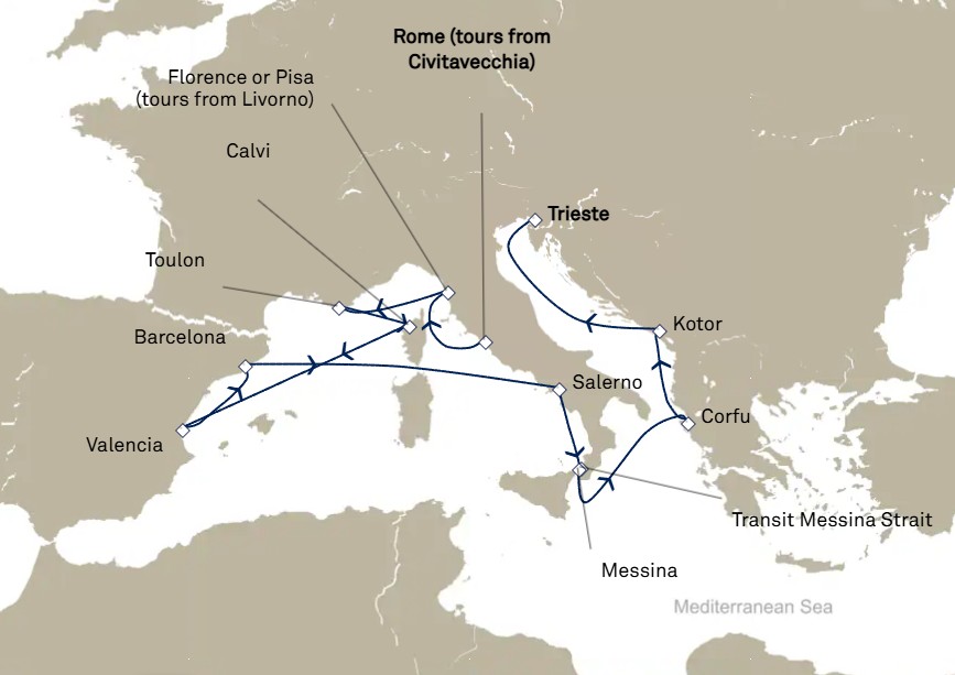 Upea kesäinen risteily aurinkoiselle Välimerelle Queen Victoria matkassa. 15 päivän risteilylle lähdetään Civitavecchiasta ja reitin varrella vieraillaan mm. Livornossa, Calvilla, Valenciassa, Almafi Coastilla ja La Seyene-sur-Merilla.