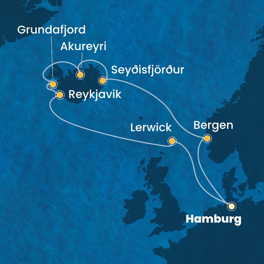 Tällä risteilyllä riittää yllin kyllin nähtävää ja koettavaa; kaikkiaan neljän häkellyttävän Islannin kohteen lisäksi pääset myös Sheltanninsaarille ja Norjan vuonoille. Lähde siis tutkimaan Pohjois-Euroopan salaperäisimpiä kohteita Islannin mystisiä geysereitä myöten. Pulahda kuumaan lähteeseen, vaikutu mahtavista vesiputouksista, piipahda pubissa Lerwickissä tai lähde huimalle funikulaariajelulle Bergenin ylle. Tiesitkö muuten, että Bergenin nimi on kveeniksi Peruna?