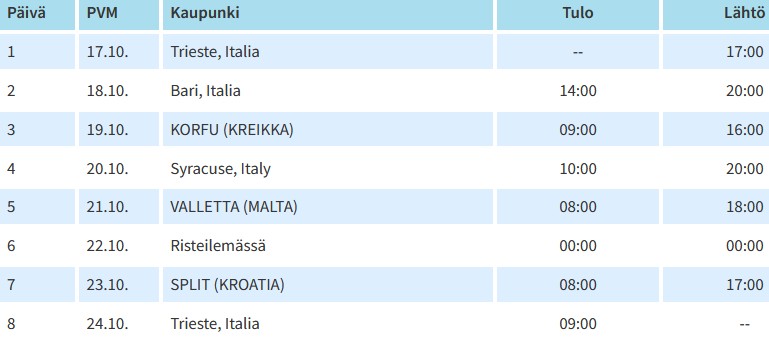 Hinnat ovat voimassa sitoumuksetta paikkatilanteen mukaan. Reitit ja aikataulut alustavia, muutokset mahdollisia. Korfun turistivero on 3 € / hlö ja se veloitetaan laivalla hyttilaskun yhteydessä. Vastuullinen matkanjärjestäjä Costa Cruises.