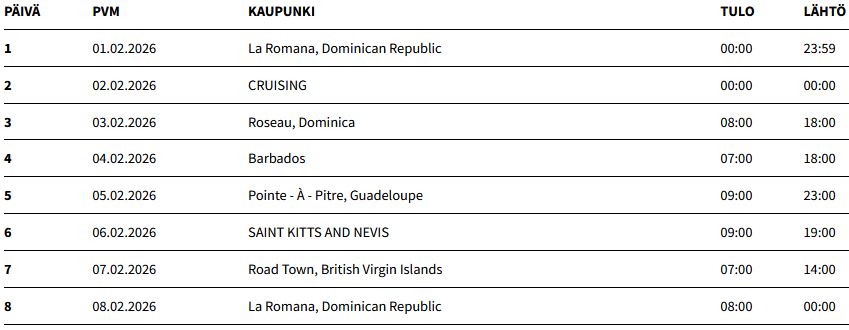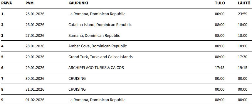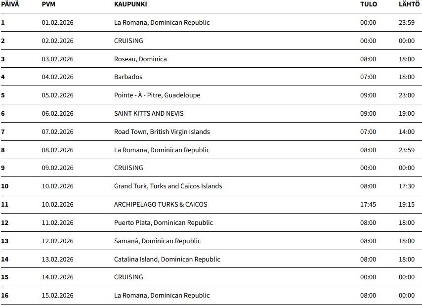 Omatoimimatkaajille lähdöt 21.12.2025 – 8.3.2026 (15 pvän viimeinen lähtö 1.3.). Valitse vain mieleisesi viikko ja toteuta unelmien matka! Räätälöimme sinulle toiveidesi mukaisen risteilyn ja olemme käytettävissäsi kaiken aikaa.