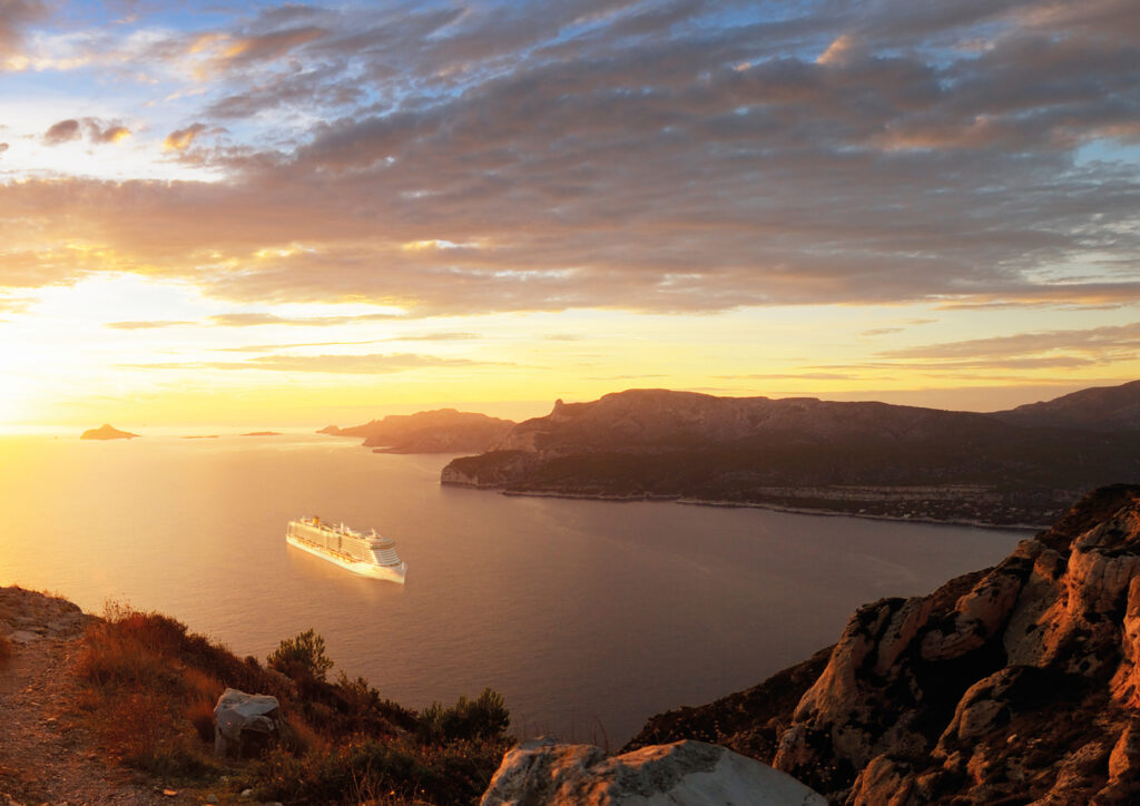 Laiva hidastaa Calanquesin kallioiden edessä, täydellinen hetki nauttia aamiaista kannella ja nauttia auringon noususta.