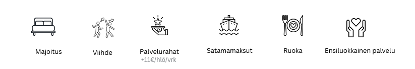 Täysihoitoristeily-pakettiin sisältyy risteily valitussa hyttiluokassa sekä kaikki ateriat (aamiainen, lounas, iltapäiväkahvi ja illallinen) laivalla. Paketin hintaan sisältyvät myös verot, ja satamamaksut. Palvelurahat voidaan maksaa etukäteen tai laivalla hyttilaskun yhteydessä.