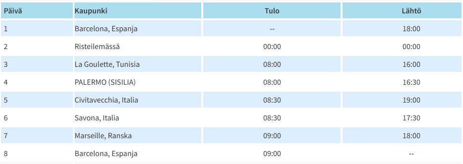 Barcelona – La Goulette (Tunis) – Palermo (Sisilia) – Civitavecchia (Rooma) – Savona – Marseille – Barcelona